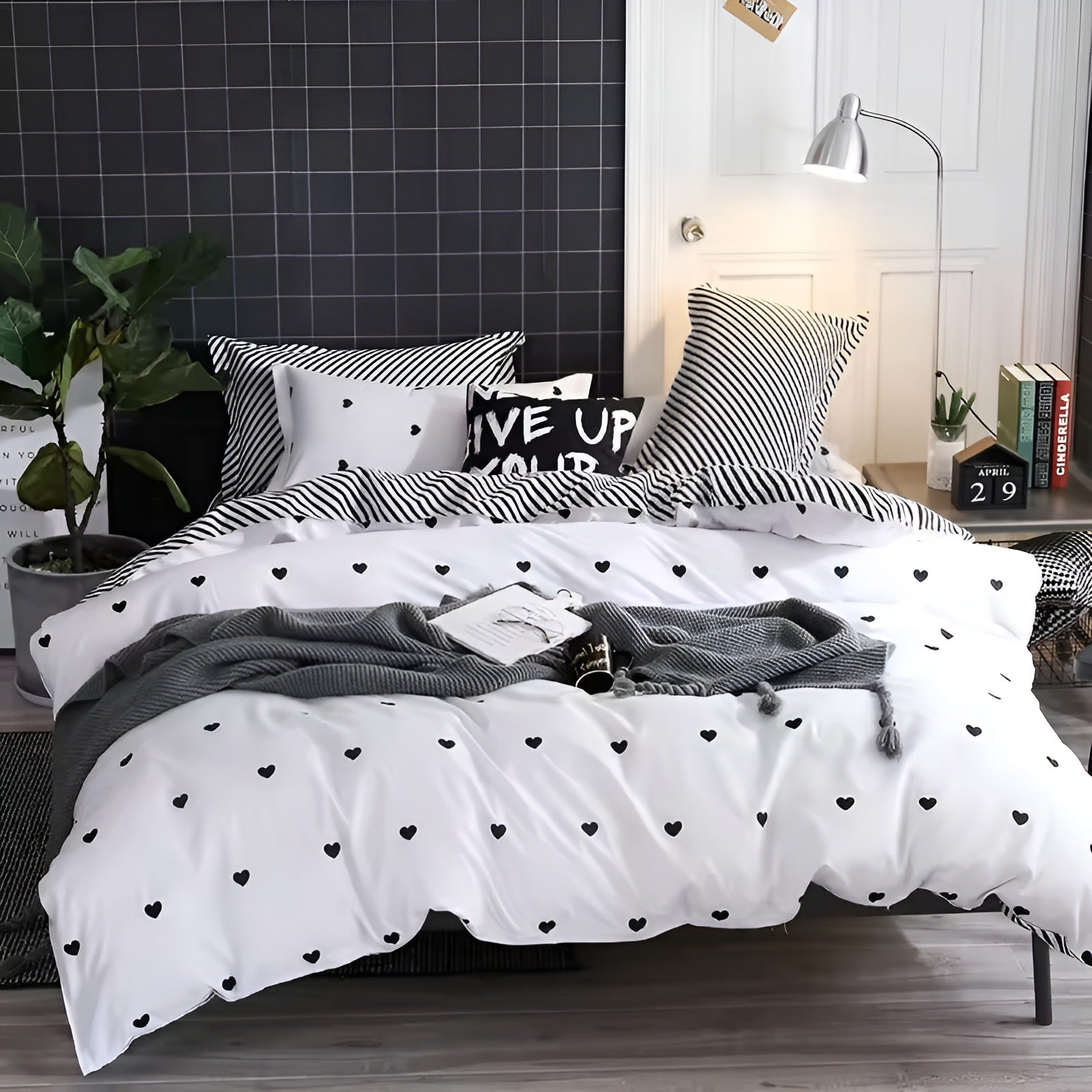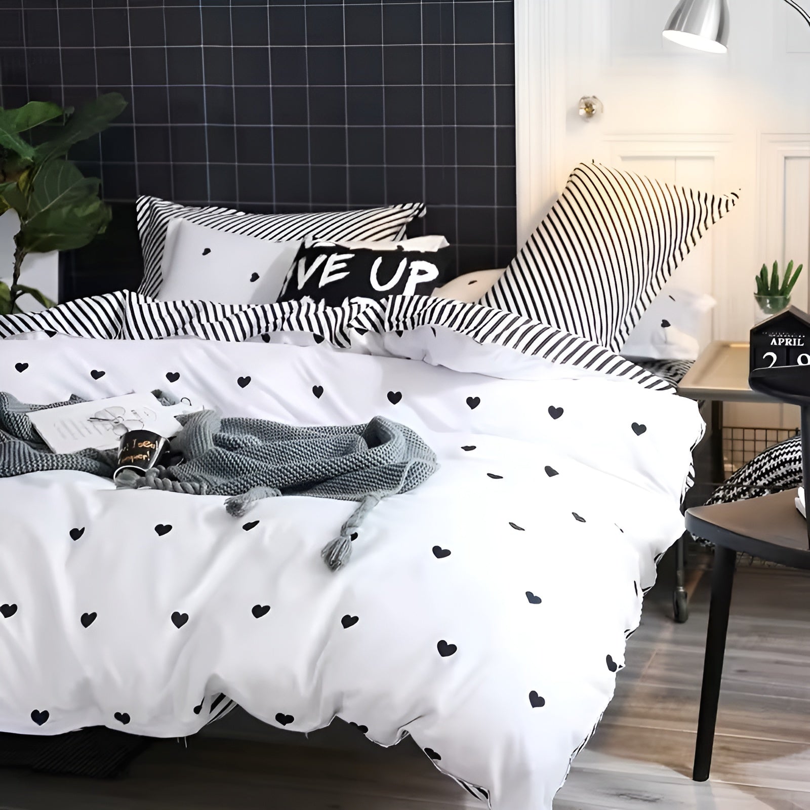 Unser CozyHearts Bettbezug mit elegantem schwarzem Liebesprint verwandelt Ihr Schlafzimmer in eine stilvolle Wohlfühloase. Dieses 3-teilige Set, bestehend aus einem Bettbezug und zwei Kissenbezügen, bietet ultimativen Komfort und ist ideal für Ihr Schlafzimmer oder Gästezimmer.