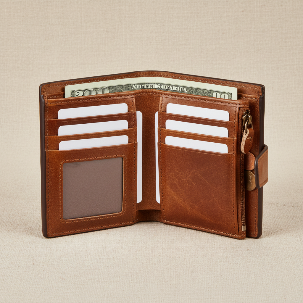 Innen finden Sie viele Kartenfächer, zwei große Bereiche für Scheine und ein kleines Münzfach mit Reißverschluss, damit alles gut sortiert bleibt. Die RFID-Technik schützt Ihre Karten unterwegs vor unerwünschtem Auslesen. Ich wollte ein Portemonnaie schaffen, das ordentlich, sicher und zugleich stilvoll ist – ein Begleiter, auf den man sich jeden Tag verlassen kann.