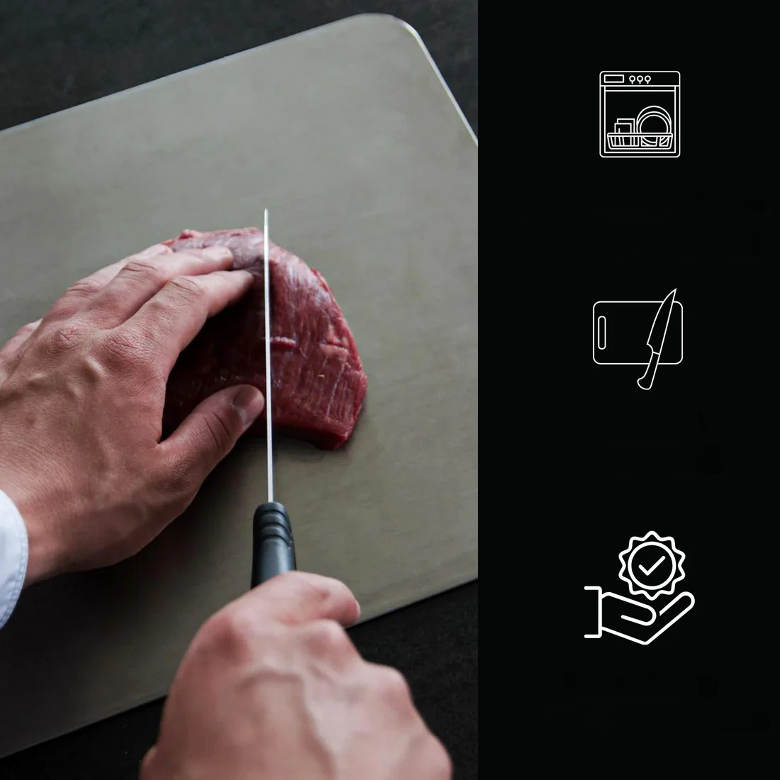 Das TitanEdge Board besteht aus 100% medizinischem Titan und bietet eine antibakterielle, geruchsneutrale und extrem langlebige Schneidefläche. Seine messerfreundliche Oberfläche hält Ihre Klingen länger scharf und erleichtert die Zubereitung Ihrer Lieblingsgerichte. Mit seiner kratzfesten und spülmaschinenfesten Beschaffenheit ist es die ideale Wahl für jeden Haushalt.