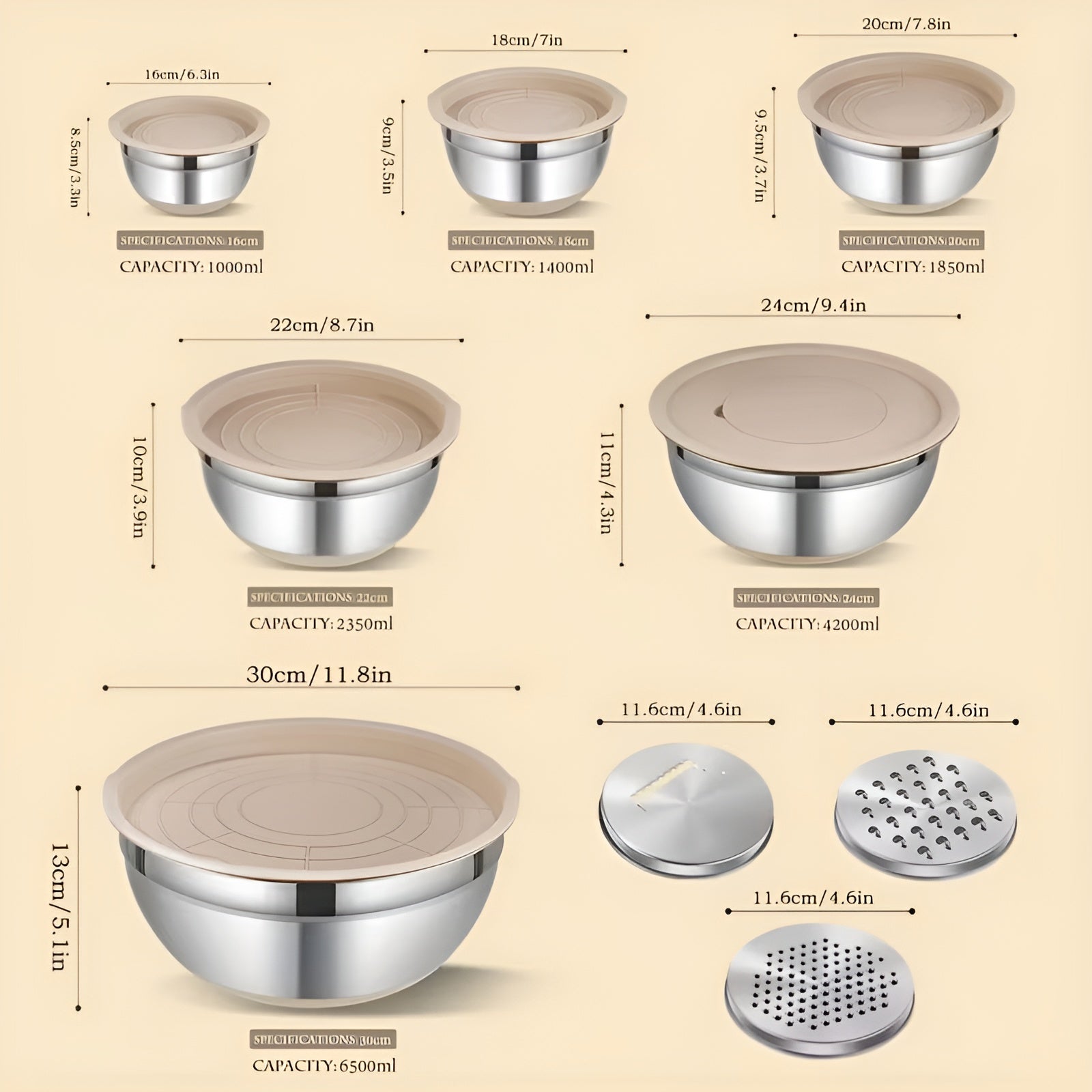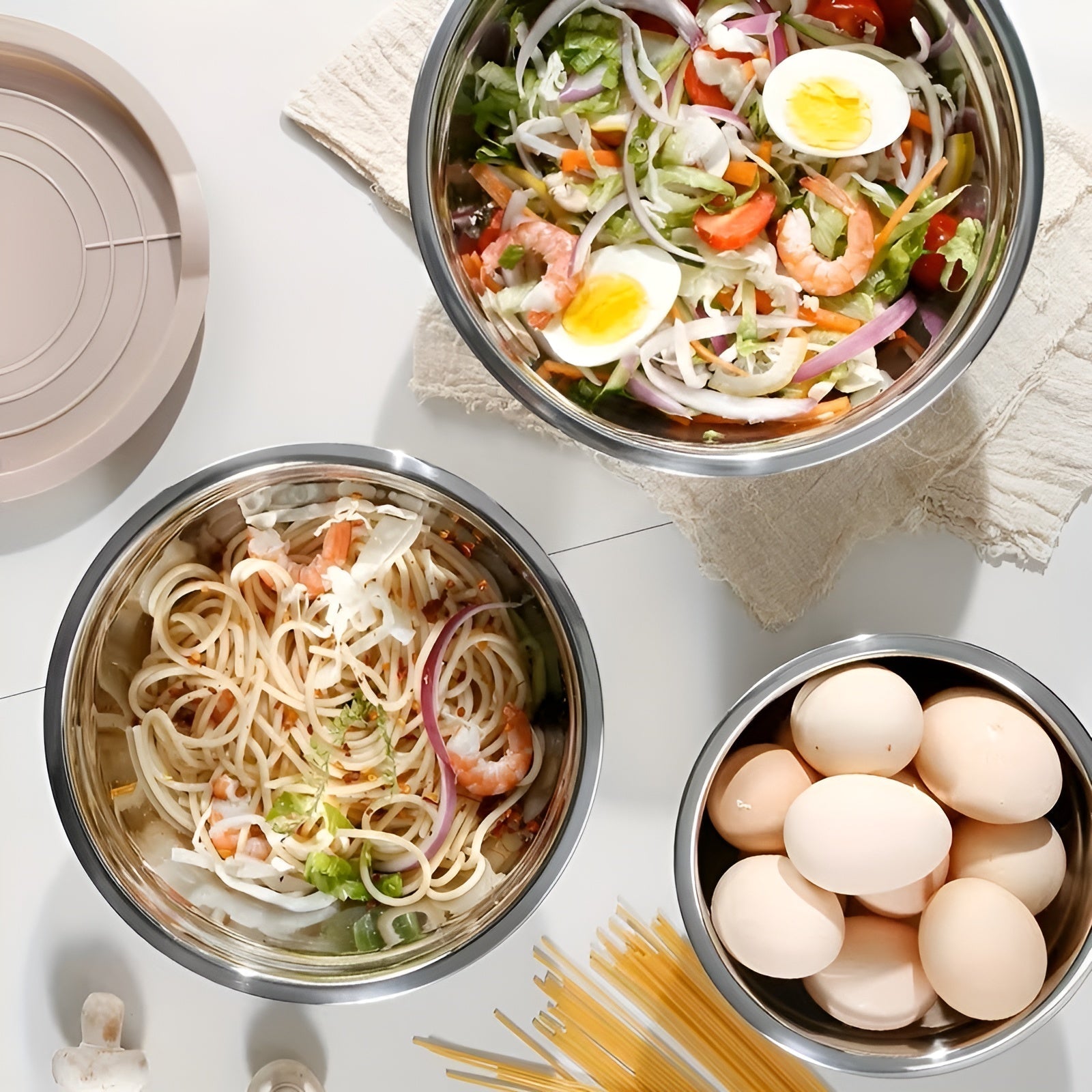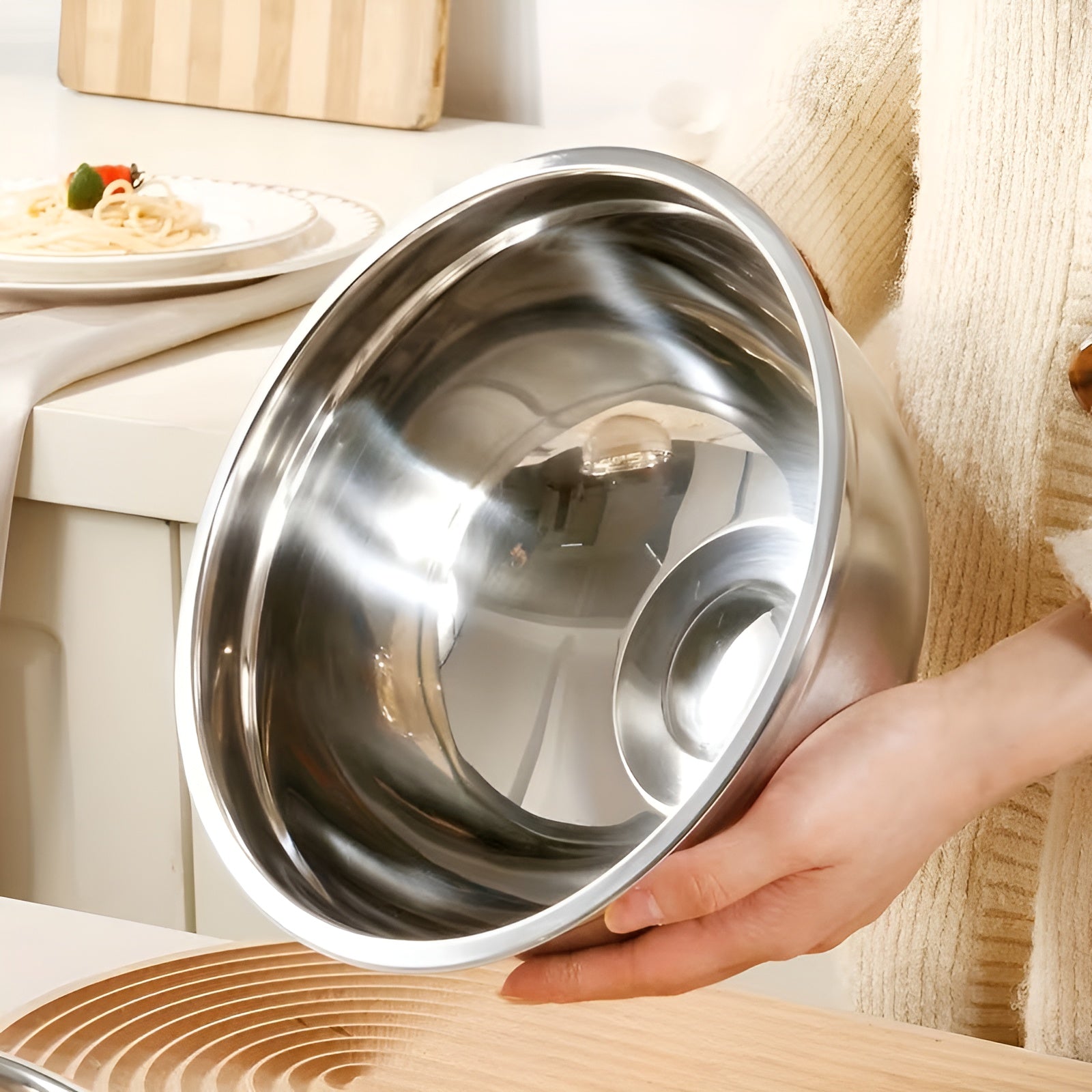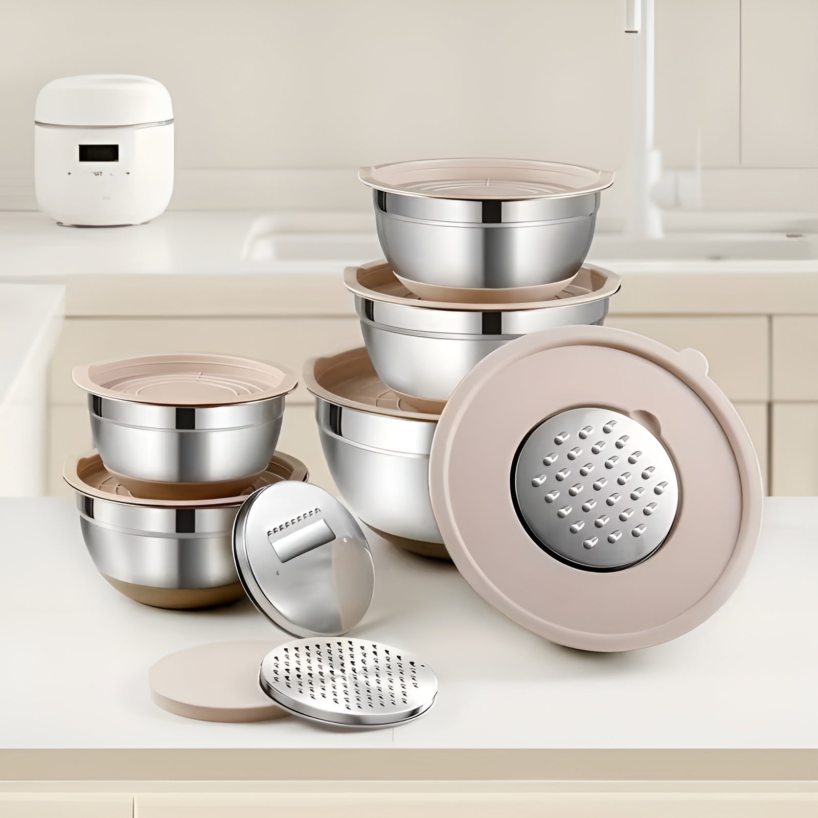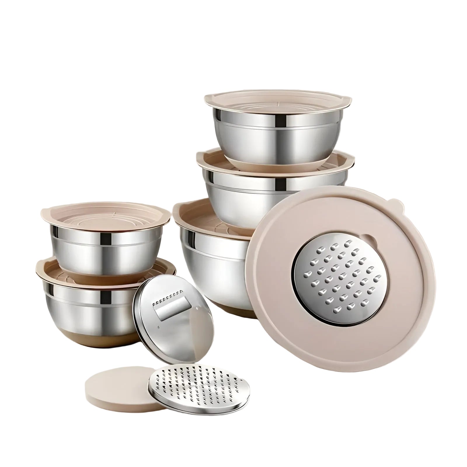 Gefertigt aus hochwertigem Edelstahl, sind die Schüsseln langlebig, geschmacksneutral und spülmaschinengeeignet. Die verschiedenen Größen decken jede Aufgabe ab – vom schnellen Dressing bis zur großen Teigmenge. Das zeitlose Khaki-Design passt in jede Küche und macht das Set auch zu einer idealen Geschenkidee.