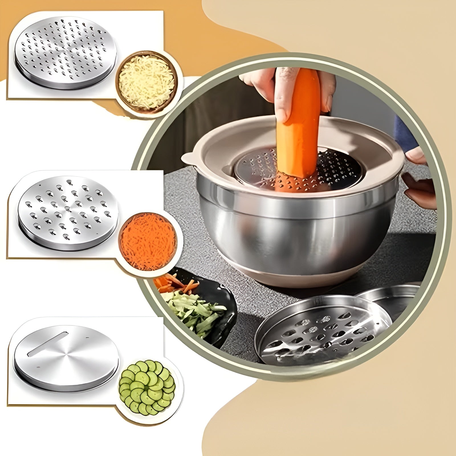 3 praktische Raspeln erweitern das Set für Käse, Gemüse und mehr. -