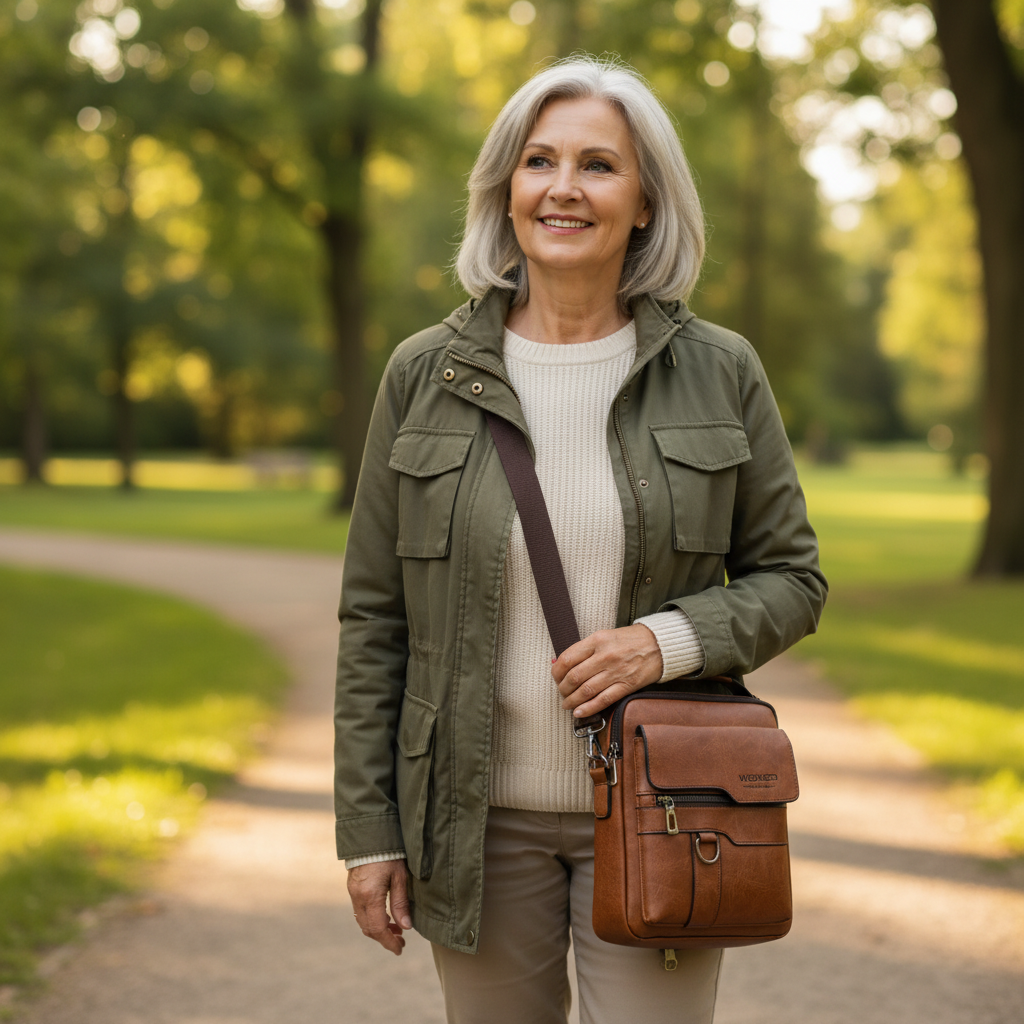 Diese kleine Umhängetasche habe ich so gestaltet, dass sie kompakt bleibt und trotzdem genug Platz für den Alltag bietet. Mit ihren rund 27 × 22,5 × 9 cm außen und dem gut strukturierten Innenraum passt sie wunderbar für ein Tablet bis etwa 11 Zoll, ein kleines Buch oder die wichtigen Dinge, die man unterwegs braucht.