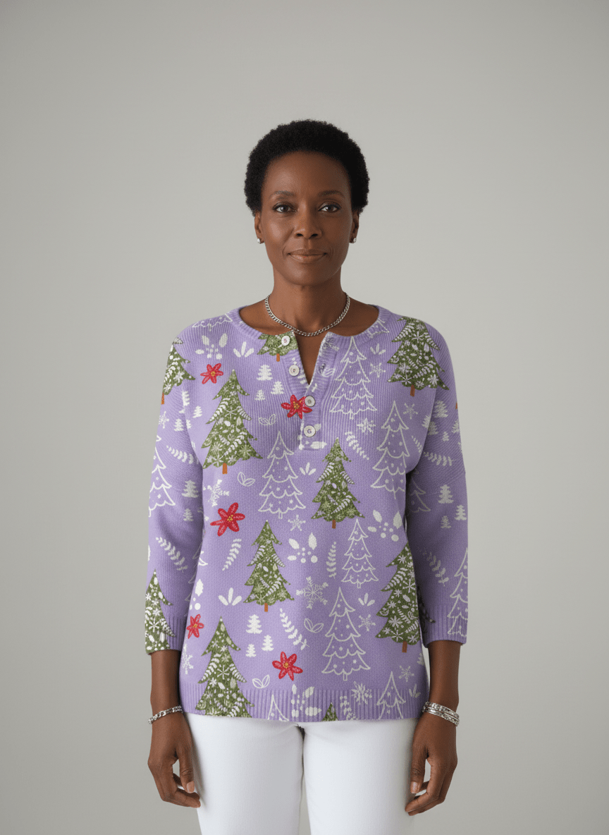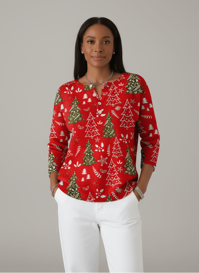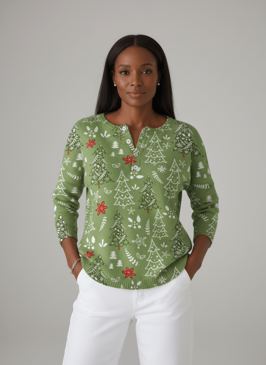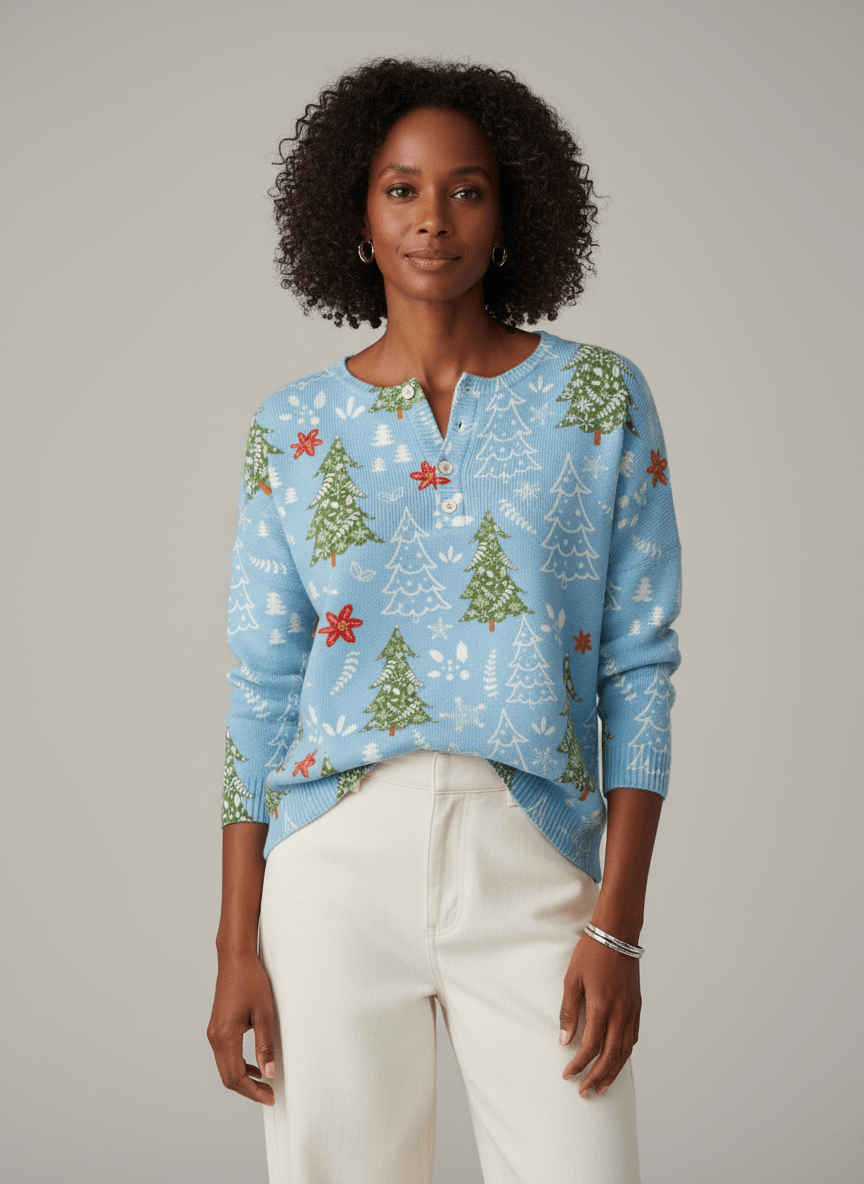 - Designdetails: Feiertags-/Weihnachtsmuster (Bäume, Blumen, Sterne), lange Ärmel, runder Ausschnitt mit kurzer Knopfleiste (Henley-Stil).
