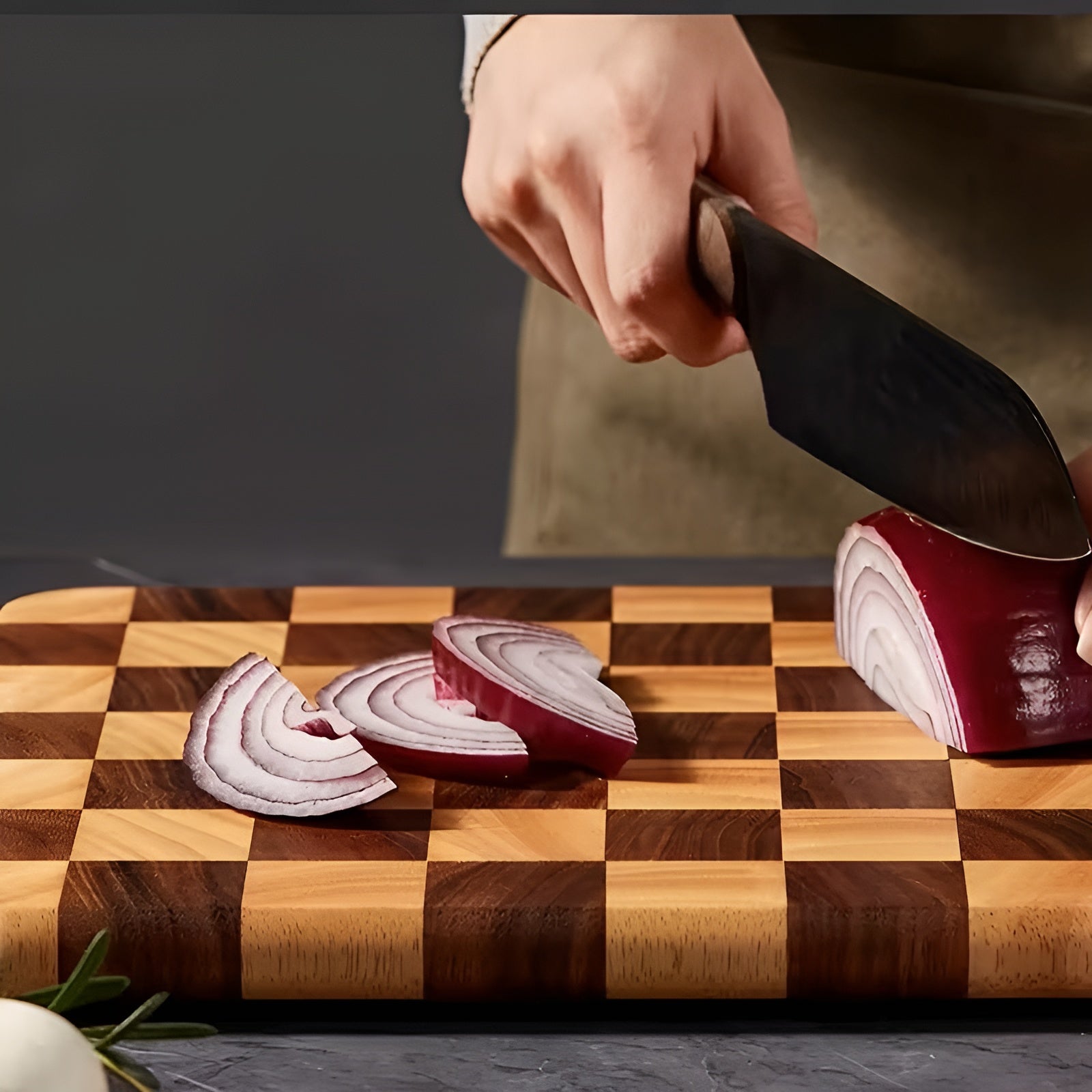 Dieses hochwertige Holz-Schneidebrett im Schachbrett-Design ist mehr als nur ein Küchenhelfer es ist ein stilvolles Statement für Ihre Küche. Gefertigt aus lebendig gemasertem Naturholz in warmen Braun- und Beigetönen, bringt es Eleganz auf jede Arbeitsfläche. Ob zum Schneiden von Obst, Gemüse und Fleisch oder zum Servieren von Käse & Snacks dieses Brett überzeugt im Alltag wie bei besonderen Anlässen. Lebensmittelsicher, robust und dekorativ zugleich