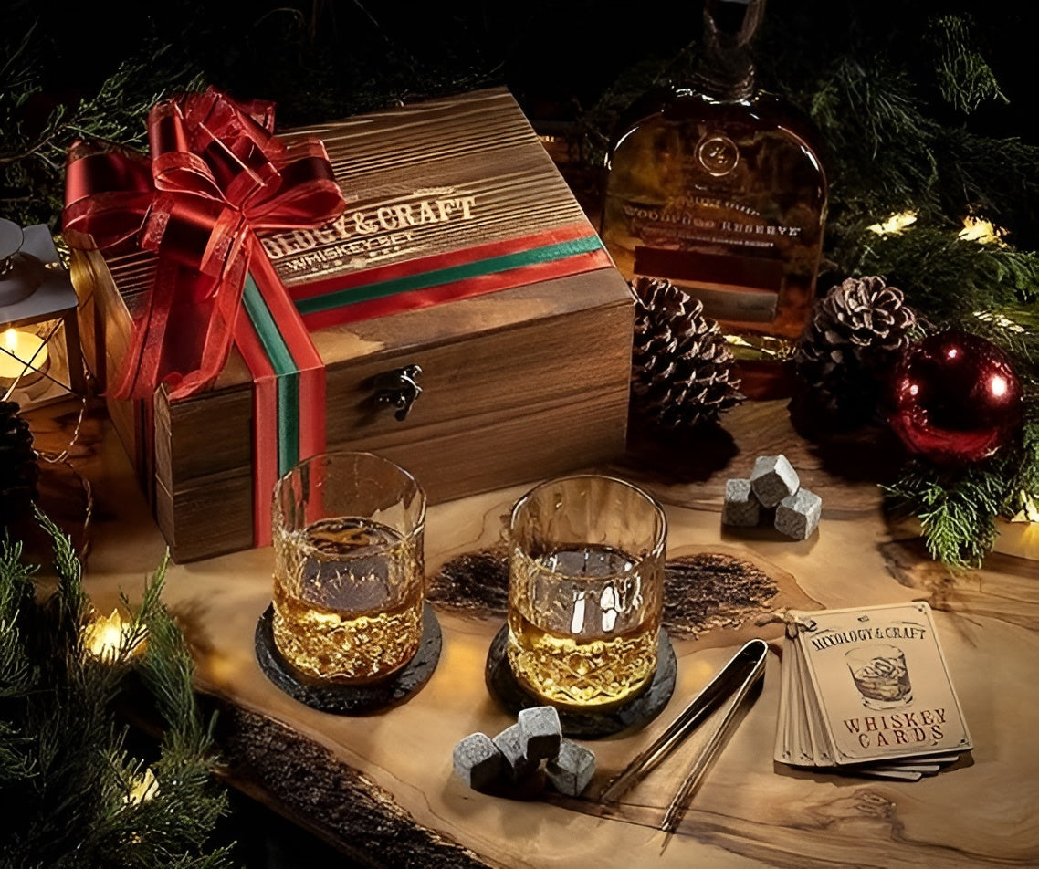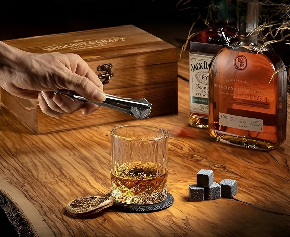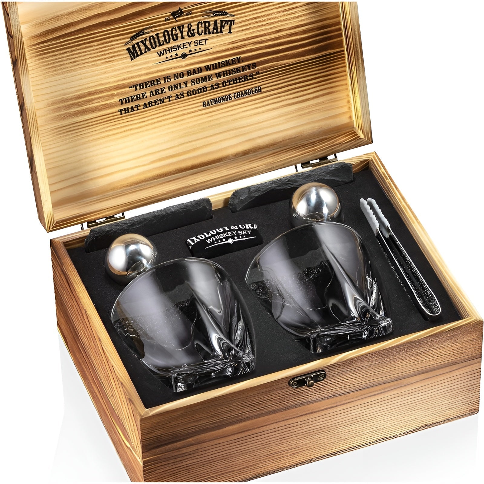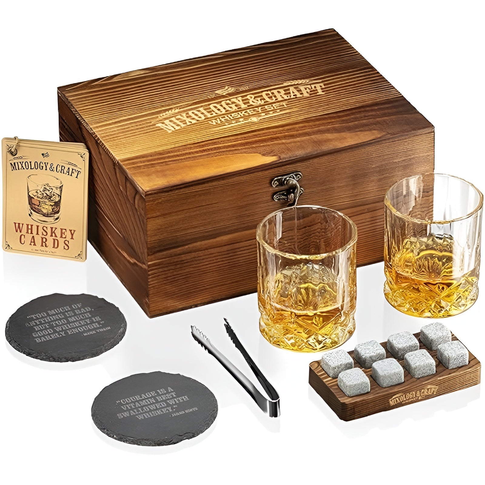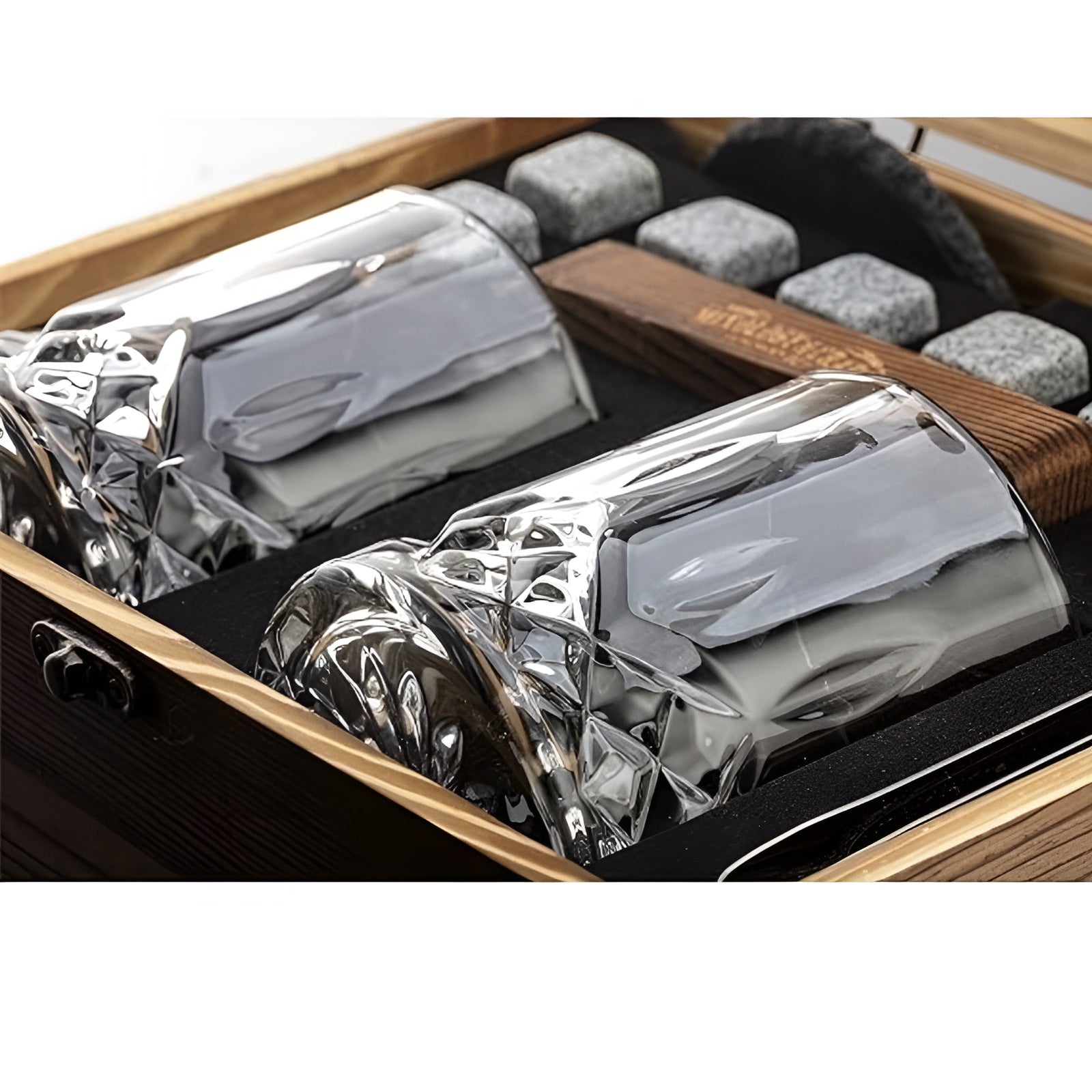 Whiskeyglas-Set mit Kühlsteinen –Mit Kühlsteinen & Kristallgläsern | Edles Geschenk mit Holzbox & Untersetzern